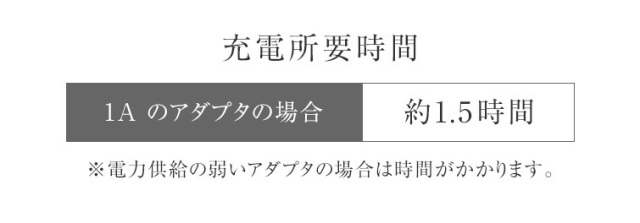 | 充電所要時間 | 充電所要時間: 1A のアダプタで約1.5時間 ※電力供給の弱いアダプタの場合は時間がかかります。 *充電しながらでも使用可能でございます |