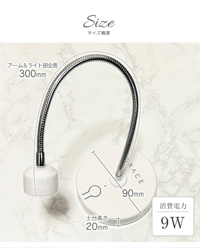| サイズ | 直径90mm×20mm(土台部分) 300mm(アーム&ライト部全長) |