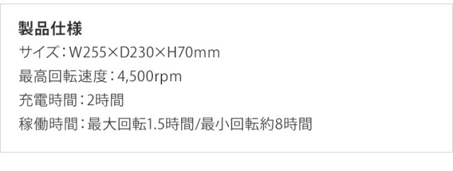 | 製品仕様 | サイズ:W255×D230×H70mm 最高回転速度:4,500rpm 充電時間:2時間 稼働時間:最大回転1.5時間/最小回転約8時間 |