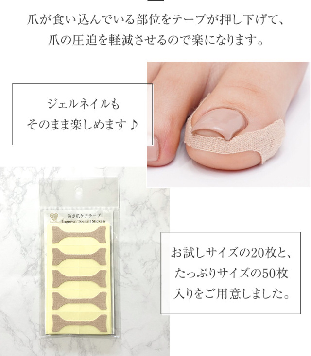 | 商品説明 | 爪が食い込んでいる部位をテープが押し下げて、爪の圧迫を軽減させるので楽になります。 ジェルネイルもそのまま楽しめます♪ たっぷり50枚入りです。 |