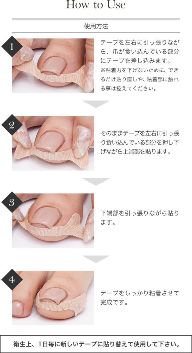 | 使用方法 | 1,テープを左右に引っ張りながら、爪が