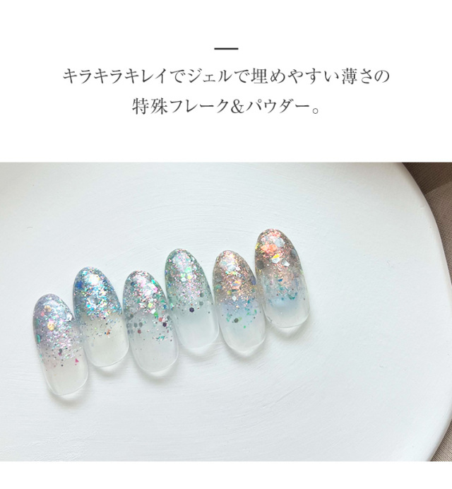キラキラキレイでジェルで埋めやすい薄さの特殊フレーク&パウダー。