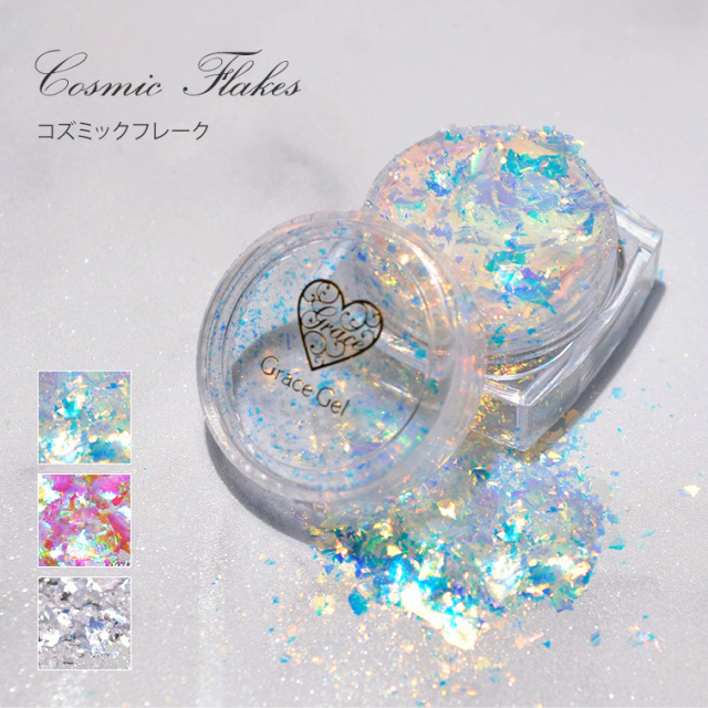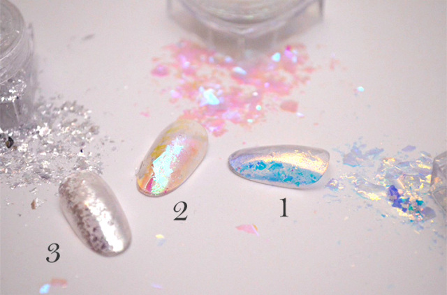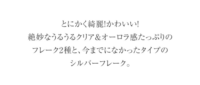 とにかく綺麗!かわいい!絶妙なうるうるクリア&オーロラ感たっぷりのフレーク2種と、今までになかったタイプのシルバーフレーク。
