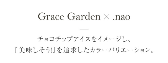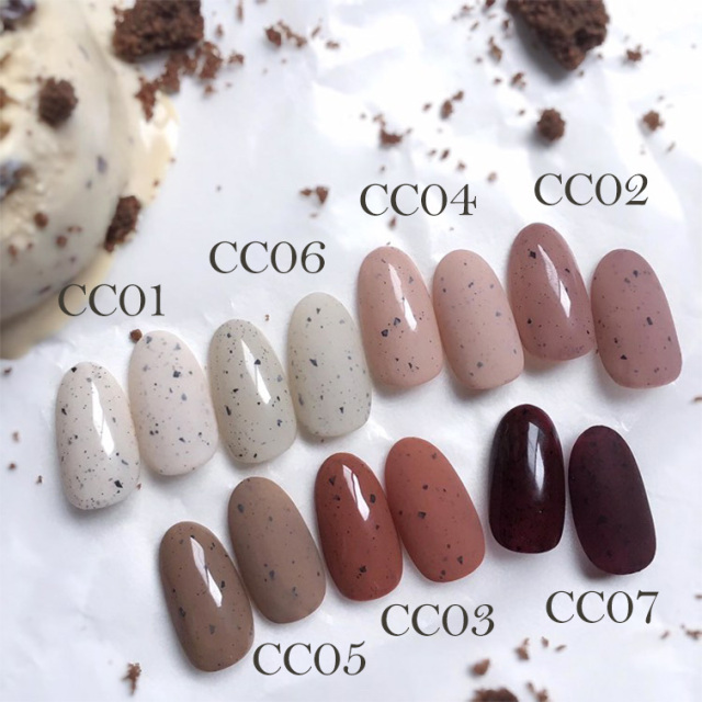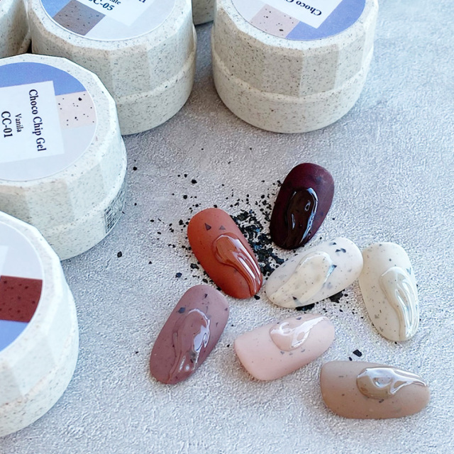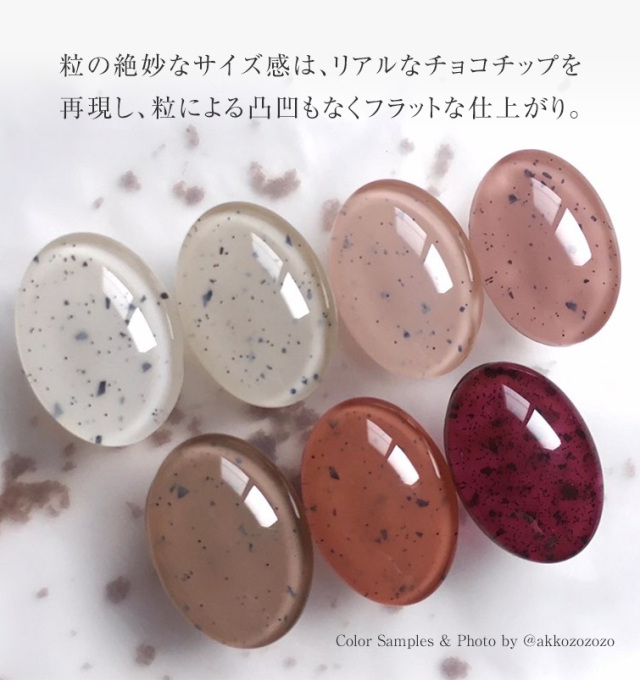 | 商品説明 | チョコチップアイスをイメージし、 『美味しそう!』を追求したカラーバリエーション。 粒の絶妙なサイズ感は、リアルなチョコチップを再現し、粒による凸凹もなくフラットな仕上がり。 硬すぎず緩くもなく、扱いやすい、初心者の方にも塗りやすいように粘度と濃度にこだわったカラー。 従来の砂ジェル特有のシアー感を無くし、マット寄りにしたので何度も塗る必要が無く、一度塗りでも十分な発色。 |