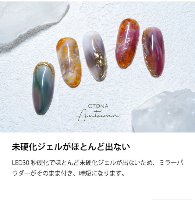 LED30秒硬化でほとんど未硬化ジェルが出ないため、ミラーパウダーがそのまま付き、時短になります。